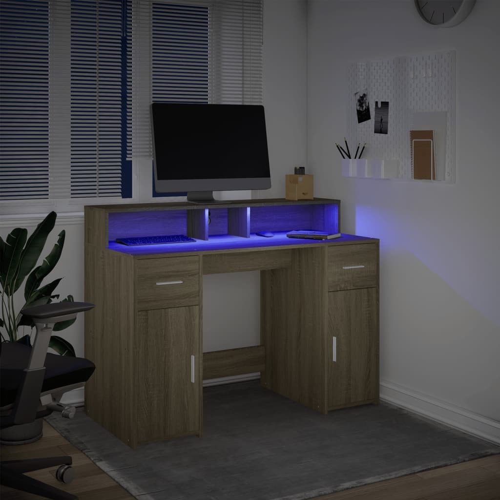 With ample storage, durable construction, and LED lighting options, this desk is perfect for creating an organised and stylish working or gaming space. Stable and durable material: Engineered wood is a durable and stable material with a smooth surface that is resistant to moisture, warping, and splitting, making it a reliable choice for various projects.RGB LED lights for a pleasant ambience: This desk features LED lights that can be easily adjusted to create a personalised light show. You can customise the modes, colours, and brightness to enhance the ambience of your interior space.Ample storage: The desk includes compartments and drawers, offering extensive storage options for all your office essentials and helping to keep your workspace organized and clutter-free.Easy maintenance: Thanks to its smooth surface, the LED desk is easy to clean with a dry and soft cloth and requires less maintenance. Please disconnect the product from the power supply or turn off the power supply when cleaning and when not in use. Warning:To prevent it from tipping over, this product must be used with the provided wall attachment device. Good to know:The product has a USB connector that requires a certified 5V USB power source (not included).
